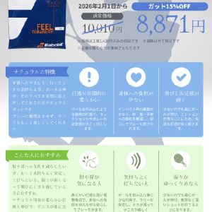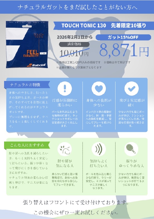 ナチュラルガットお試しキャンペーン開催します! 2026.01.31 Tweet Share Hatena Pocket RSS feedly Pin it 対象はナチュラルガットの王道モデルとも言える Babolat Touch Tonic 130!! これまで「気になっていたけど、使ったことがない」 そんな方にこそ、今がチャンス!! 是非ともこの機会をお見逃し無く!! Tweet Share Hatena Pocket RSS feedly Pin it 2026年 2月期・週間レッスンスケージュール