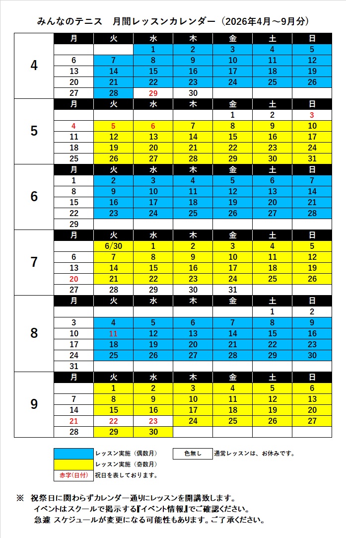 月間レッスンカレンダー(2026年4月~9月分) 2026.03.03 Tweet Share Hatena Pocket RSS feedly Pin it みんテニ月間カレンダー(2026年度・上期) Tweet Share Hatena Pocket RSS feedly Pin it 3月期・週間レッスンスケージュール WEBサイトメンテナンスのお知らせ
